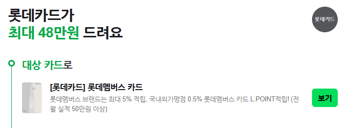 이번 이벤트의 주인공은 롯데멤버스 카드입니다. 롯데 브랜드에서 최대 5% 적립, 일반 가맹점에서 0.5% L.POINT 적립이 되는 구조입니다. 다만 전월 실적 50만원 이상이라는 조건이 있으니, 월 카드 사용액이 어느 정도 되시는 분들께 적합하겠습니다.