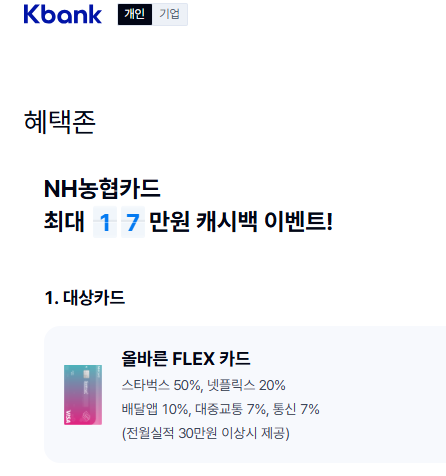 이것이 농협카드의 가장 큰 특징입니다. 케이뱅크를 포함해서 어떤 채널이든 농협카드 이벤트 혜택을 받으셨다면 평생 다시 참여할 수 없습니다. 그만큼 신중하게 결정하셔야 합니다.