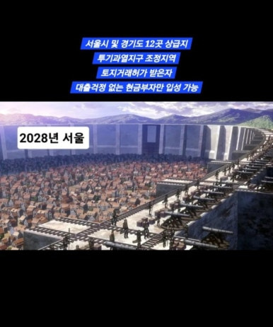 10월 15일 대책 이후 온라인에서 ‘진격의 거인’에 빗대어 서울 부동산을 표현한 짤이 유행했던 것도 같은 맥락이겠죠. 규제가 나올수록 서울, 그중에서도 강남을 중심으로 한 핵심 지역은 더 단단해졌고, 외곽이나 대안 선택지는 오히려 더 팍팍해졌습니다.