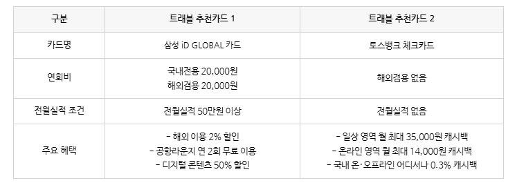설 연휴 가족 여행에서는 카드 하나로 모든 상황을 커버하기 어렵습니다. 삼성 iD GLOBAL 카드는 큰 금액 결제와 여행 동선 관리에 강점이 있고, 토스뱅크 체크카드는 현금 사용과 잔돈 관리에 특화돼 있습니다.