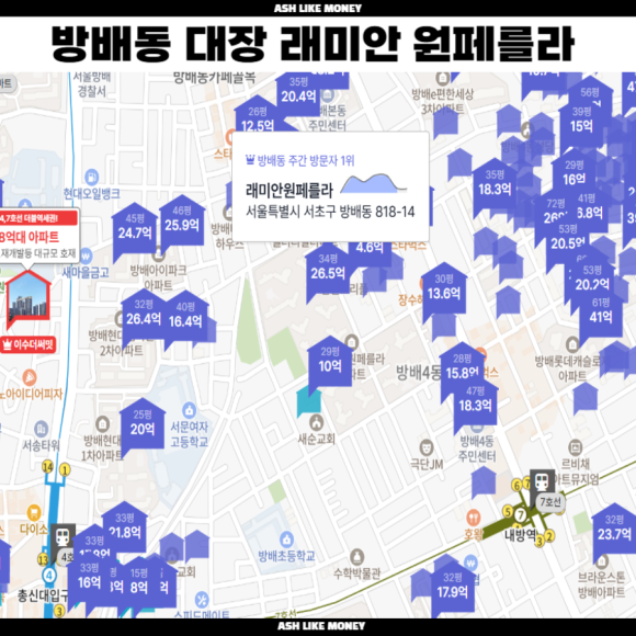 반포에는 래미안 트리니원, 래미안 원펜타스, 래미안 원베일리, 래미안 퍼스티지로 이어지는 이른바 쿼드라 래미안이 자리 잡았다. 이 단지들은 평당 2억 원 수준이 거론되는 서울 최고가 아파트들이다. 이 라인을 기준으로 보면, 방배동의 신축 아파트 시세가 20억~30억 원을 넘어가는 것도 이제는 이상한 일이 아니다.