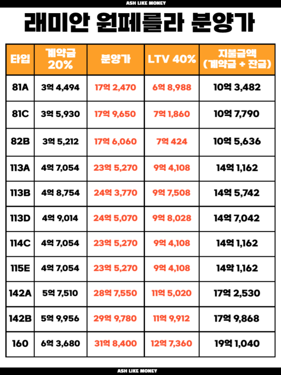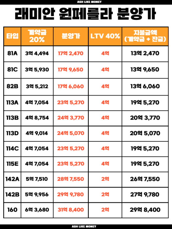 전용 59타입은 16억~17억9천만 원, 전용 84타입은 22억~24억5천만 원, 전용 106타입은 28억~30억 원, 전용 120타입은 30억~31억8천만 원으로 책정됐다. 분양 당시에는 인근 디에이치 방배보다 2억 원가량 비싸다는 평가가 나왔고, 고분양가 논란도 있었다.