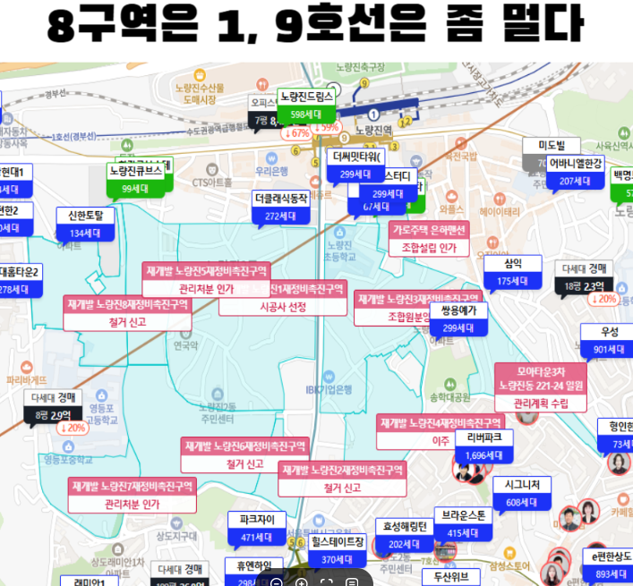 노량진뉴타운 전체를 놓고 보면 1, 3, 5구역은 노량진역 생활권, 2, 4, 6, 7구역은 장승배기역 생활권으로 나뉜다. 8구역은 이 사이에 위치해 생활권 분산 효과와 향후 동선 개선 여지를 동시에 가진 구역이다. 이미 프리미엄이 10억 원 이상 형성된 상황에서, 관리처분인가 이후 단계라는 점은 투자 진입 장벽을 높이는 요소이기도 하다.
