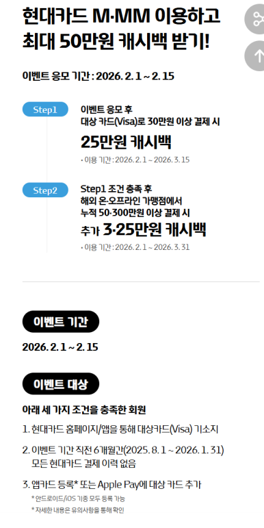 - 현대카드 단기 고효율 공략 → 2월 15일 전 응모 시 25만원 즉시 확보함